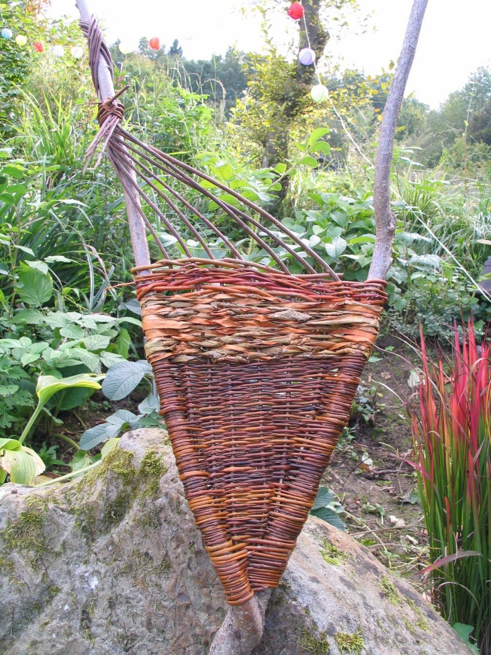 Wir flechten in eine Haselnuss-Astgabel ein Weidensegel.