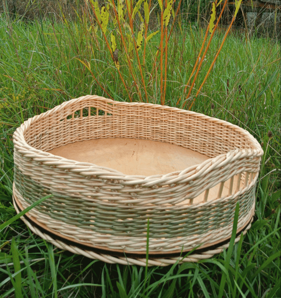 In diesem Kurs flechten wir ein Tablett aus weißer Weide auf einer geölten Holzplatte (⌀ 450 mm). Außerdem könnt ihr das Arbeiten mit Schienen kennenlernen, wie man sie aus der Feinflechterei kennt. Ihr könnt euer Tablett individuell mit unterschiedlich gefärbten Weidenschienen flechten.